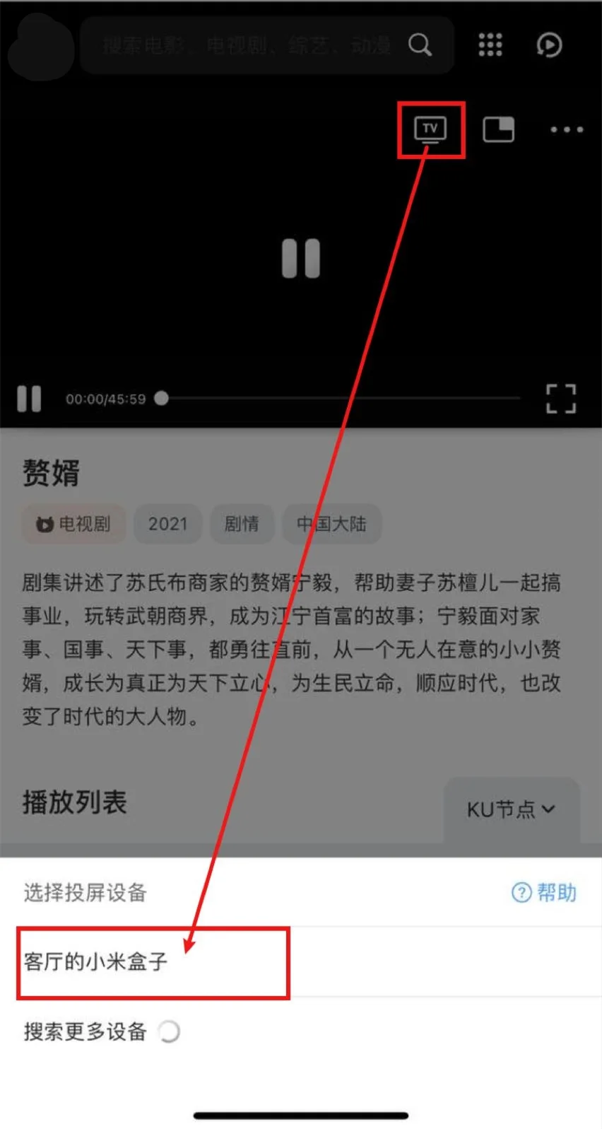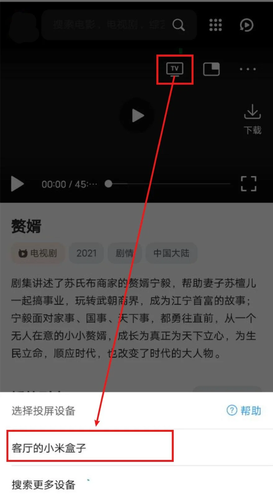 打开QQ浏览器(会接管网页播放器)->打开视频分享 - 卡路里->播放视频->选中投屏图标->等待搜寻出智能电视/电视盒子->选中,即可投屏。